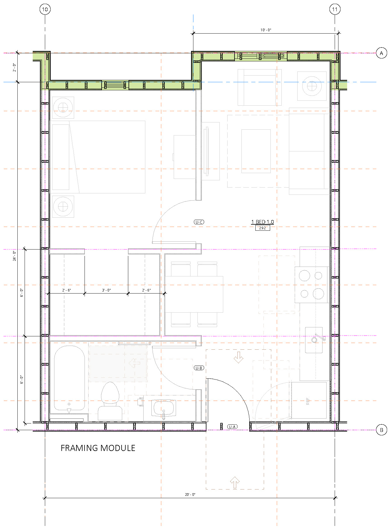 The client saw this as a prototype for affordable housing, looking to make each residential unit a standard module that could be used throughout future projects. Cost containment strategies challenged our architects and interior designers to develop new solutions that would provide housing for more families, per dollar spent. The entire architectural, engineering, and construction team operated under lean design principles, collaborating early and often about things like how to configure window alignments in order to maximize plywood placement and reduce framing cuts.