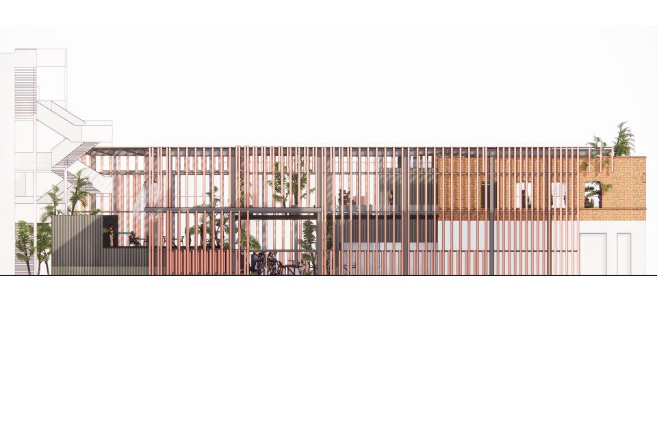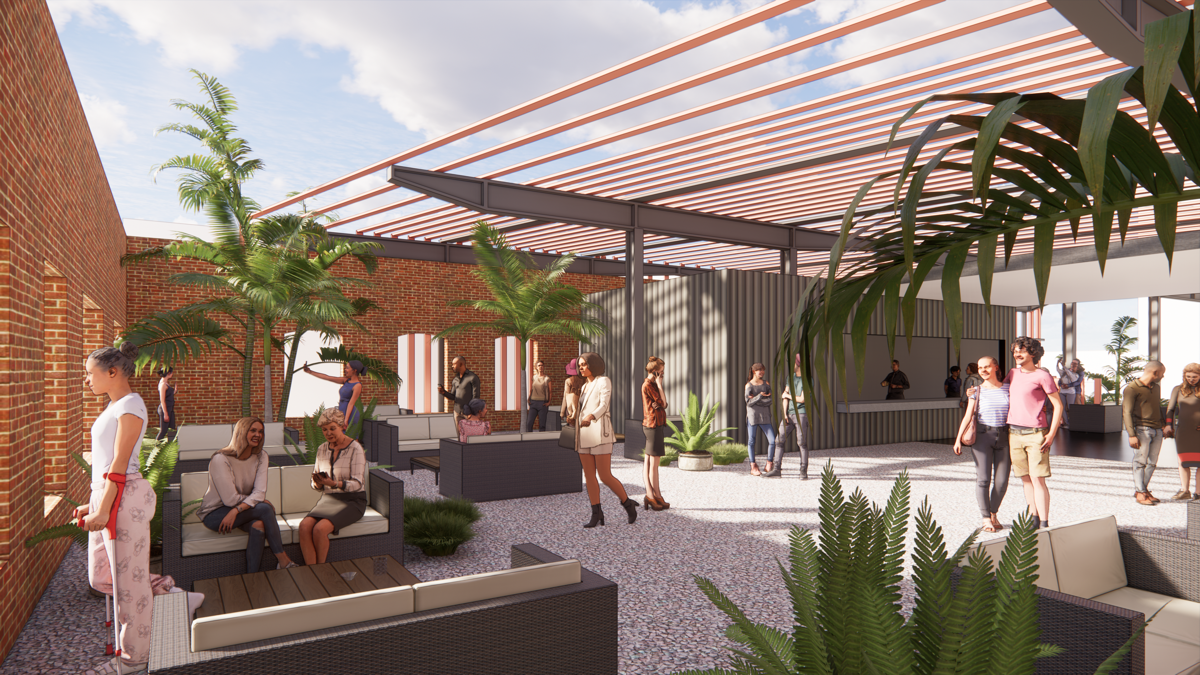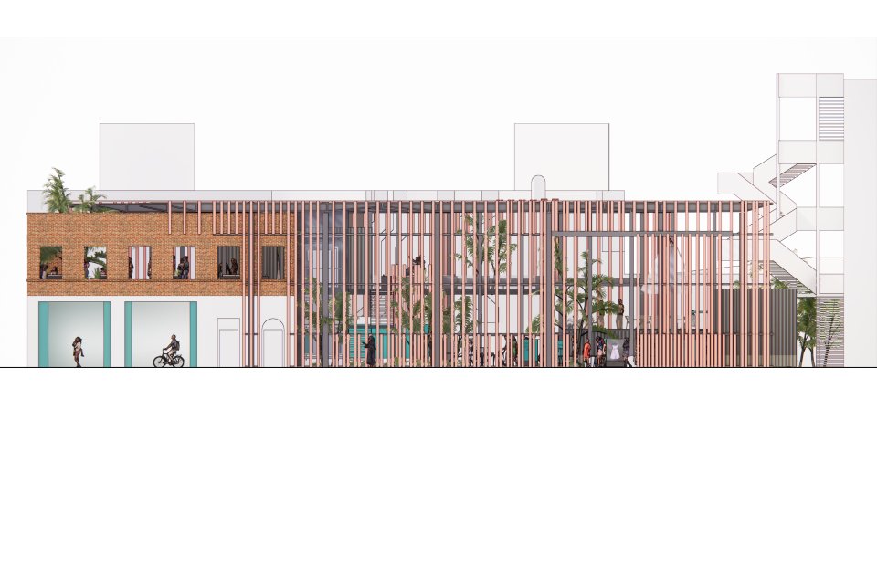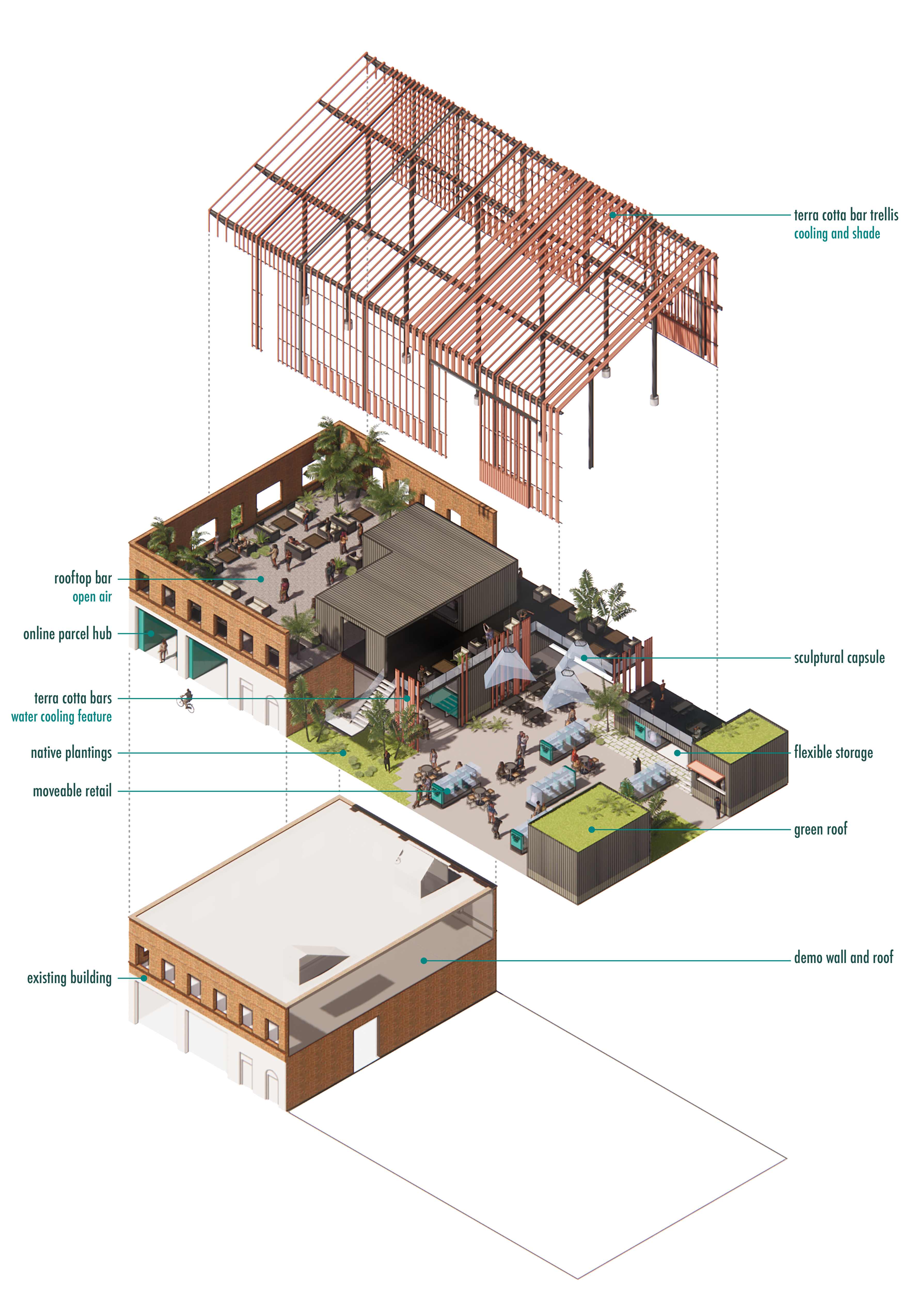 Enclosure without enclosure The architectural trellis unifies the new and the old into one open-air courtyard and retail area. Made of terracotta, portions of the vertical bars have integrated water streaming down the face to create a cooling effect for the patrons.
