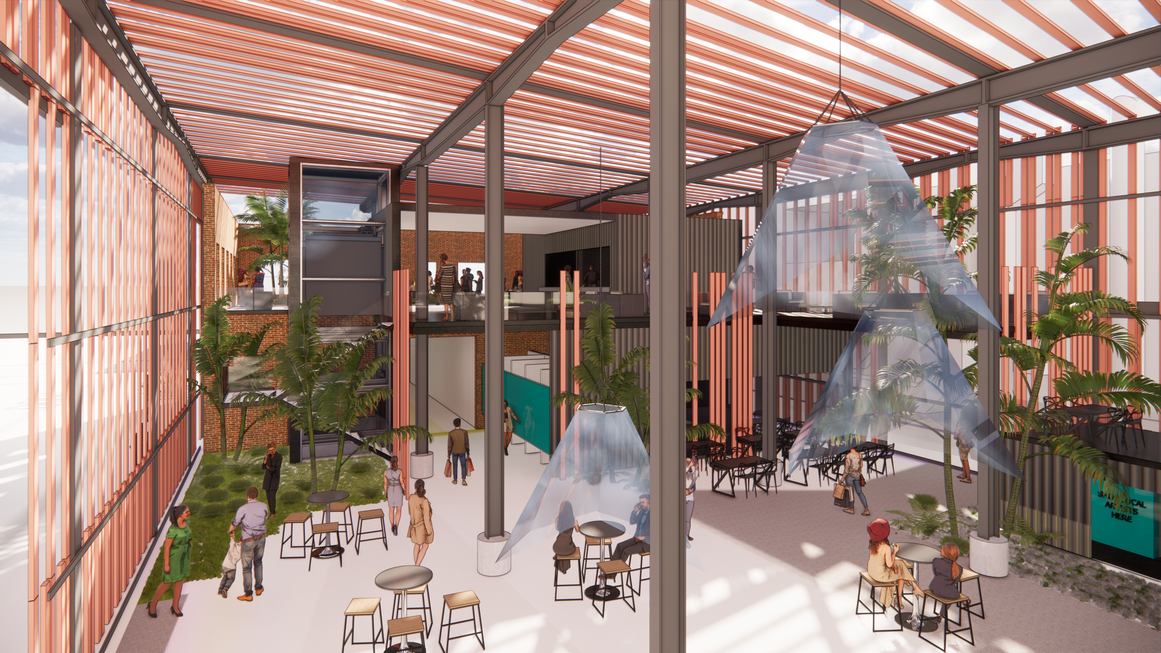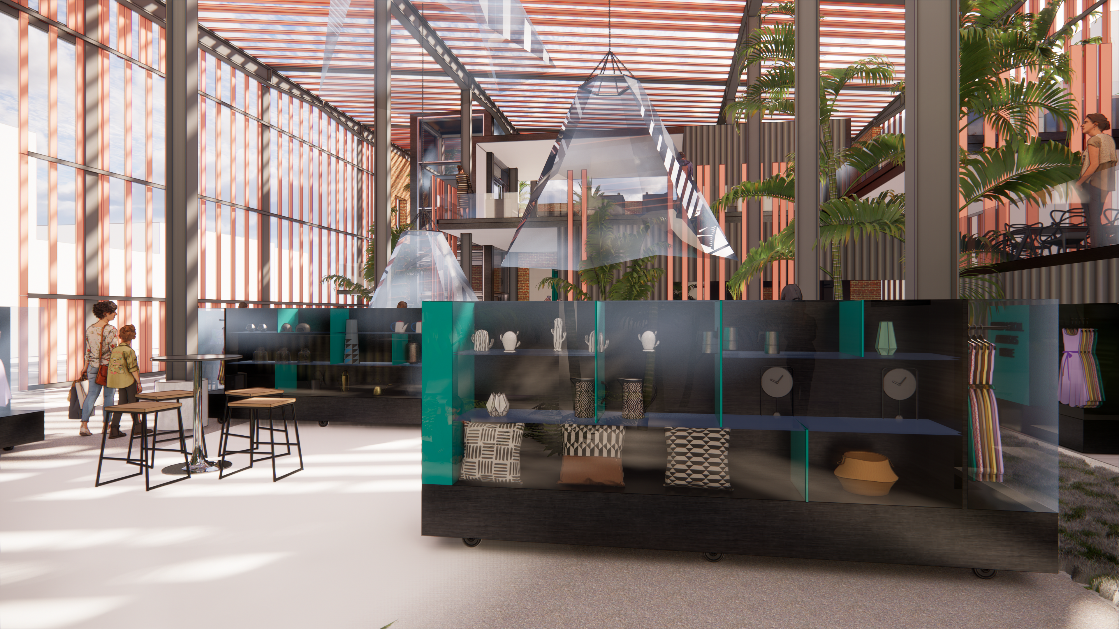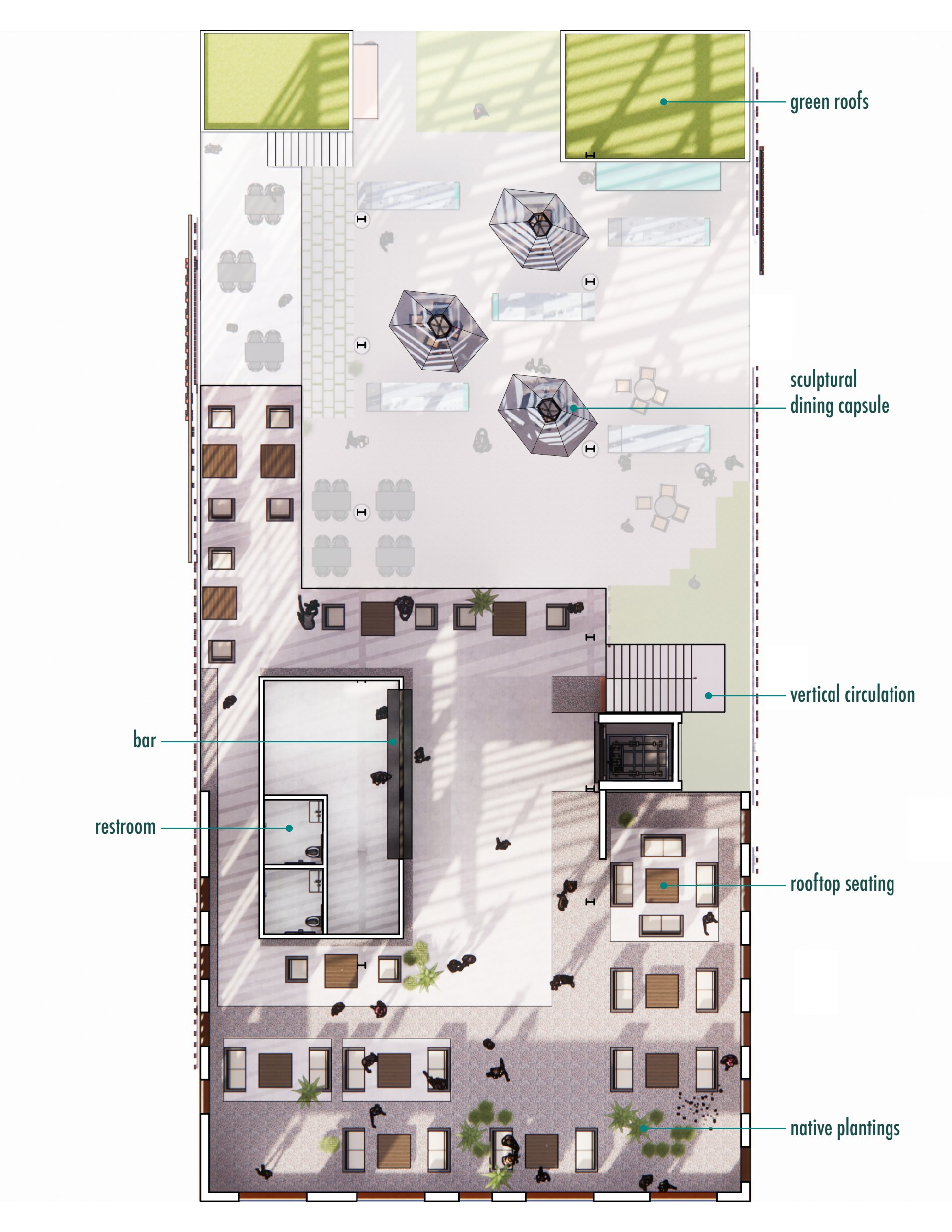 Adaptability Flexible seating and display cases can move into the open space or street for events. The space is available for neighborhood residents to gather or host live music, weddings, or other events. Large chandelier-like art installations can lower to create private dining capsules.
