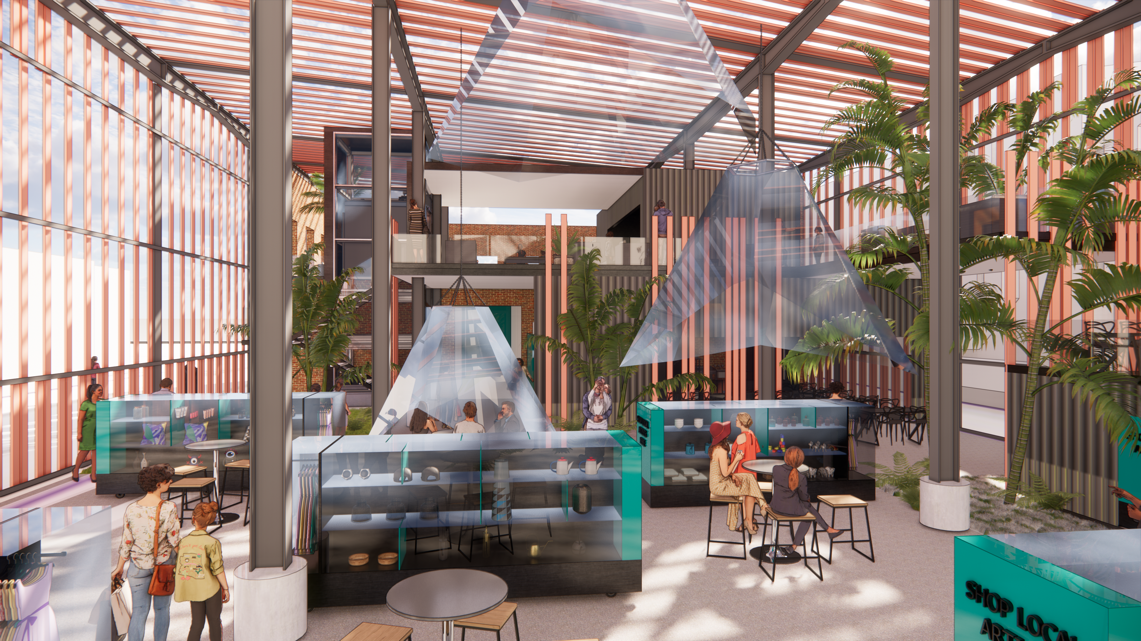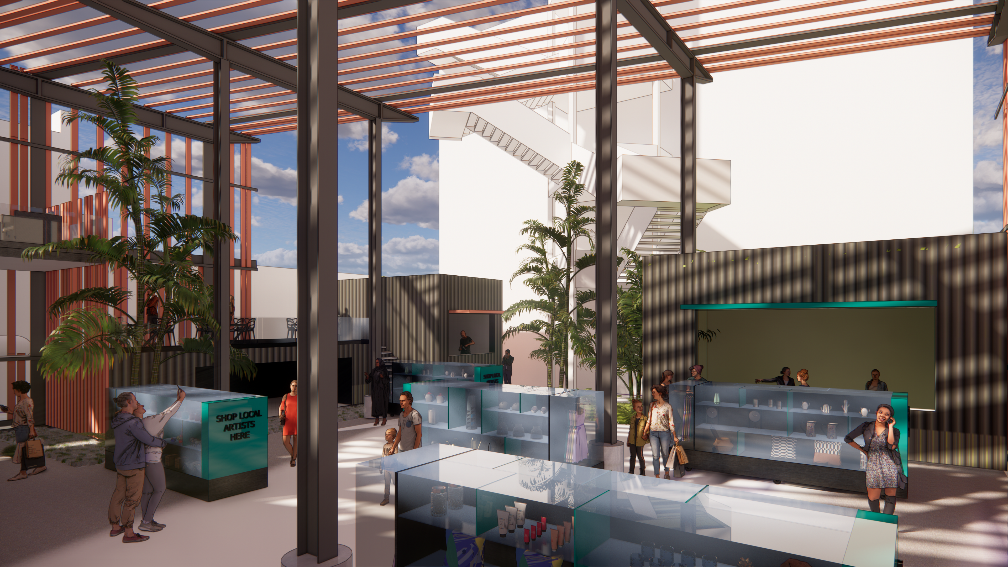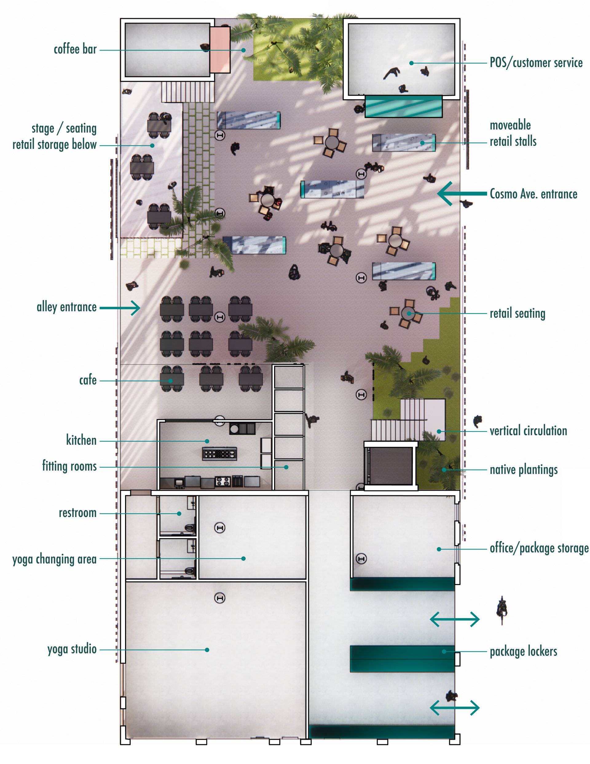 Our team of three designed Terra Cosmo and took first place. We envisioned a multi-purpose gathering place with retail, food, entertainment, and the flexibility to be rented out for events. We opted to retain the existing building shell and develop new construction around it.